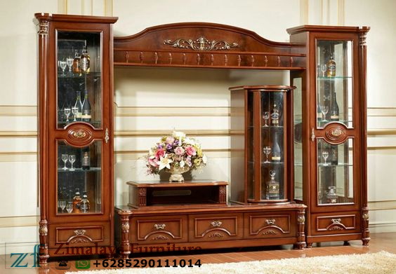 Bufet Hias Ruang Tamu Jati– Produk pengrajin Furniture Jepara memang tidak ada matinya pasti selalu berinovasi baik dalam segi model, motif dan desainya oleh karena itu pada kesempatan kali ini kami selaku pengrajin langsung Jepara menyajikan produk furniture untuk penghias ruang tamu agar menjadi tambah bagus, elegan dan mewah serta lengkap dengan barang furniturenya yaitu Bufet Hias Ruang Tamu Jati. Bufet dengan model klasik yang diberi ornamen-ornamen ukir khas Jepara yang halus, rapi dan menunjukan seni ukir yang tinggi. Bufet ini terdiri dari 4 bagian yaitu 2 lemari kecil, bufet ditengahnya dan dilengkapi dengan rak dibagian atasnya. Bufet seperti ini cocok untuk anda yang ruangannya ingin tampil bagus dengan memanfaatkan bufet sebagai tempat barang hias anda dirumah.