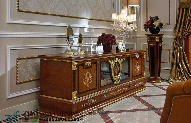 Bufet Jati Ruang Tamu ini adalah salah satu produk unggulan kami karena modelnya yang modern dan klasik serta warna yang pas sehingga banyak yang menyukainya. Bufet dengan kombinasi warna natural jati dengan emas menjadikan Bufet ini terlihat sangat mewah sehingga sangat cocok ditempatkan diruang tamu atau ruangan lain yang sekiranya cocok ditempati. Bufet ini terdiri dari 4 pintu yang 2 pintu tengahnya diberi kaca dan 4 laci dibawahnya serta ditengahnya diberi hiasan seperti mahkota menutupi sebagian kaca.