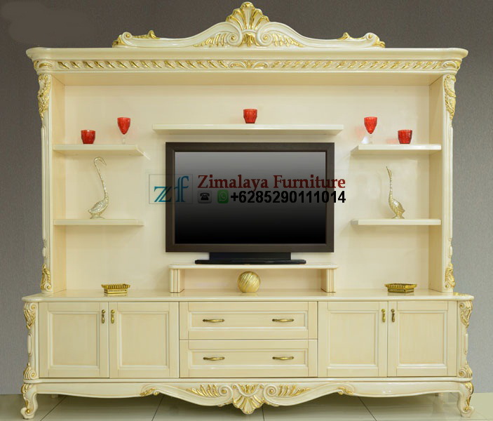 Perpaduan Warna Crem dan Emas menjadikan Bufet TV yang satu ini terlihat tampak Elegan serta dipemewah dengan adanya ukiran mahkota diatasnya yang halus, rapi dan menonjolakan seni ukir yang tinggi.