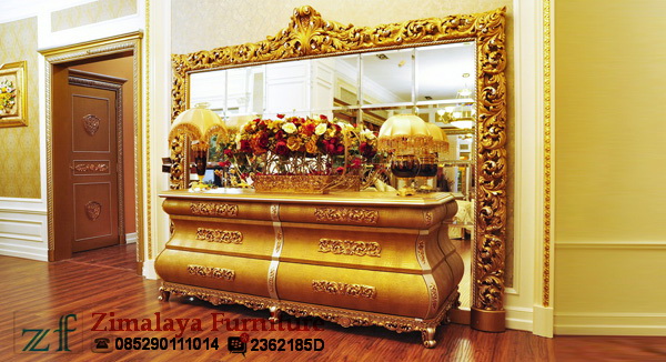 Kami tawarkan barang Furniture Mewah yang bisa untuk mempermewah ruangan anda terlebih ruang tamu yaitu Bufet Ukir Warna Emas dengan model bufet bombay yang diberi warna emas mengkilap. Bufet ini semacam bufet bombay yang terdiri dari 6 laci serta disetiap lacinya diberi ukiran. Untuk mempermewah lagi yaitu ditambahin dengan assesoris seperti figura dibelakanganya dengan model ukiran mewah yang diberi warna emas mengkilap.