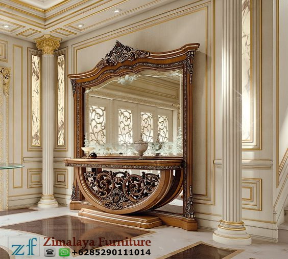 Dresser Ukir Jati adalah salah satu koleksi kami yang ditawarkan untuk anda yang mempunyai ruangan yang terbilang luas dan desain ruangan yang mewah agar ruangan bertambah bagus dan cantik. Produk Dresser seperti ini ada juga yang menyebutnya meja konsul yang mana kegunaanya sama yaitu untuk mempercantik ruangan. Dresser dengan model ukir yang mana pada tengahnya dibentuk melengkung setengah lingkaran yang tengahnya diberi ukiran mewah khas Jepara dan mewahnya lagi backdropnya diberi figura besar dengan rangka kayu yang diberi beberapa ukiran dan diberi magkota ditengah atasnya. Perpaduan warna dasar dengan warna ukiranya menonjolkan seni ukir klasik yang mewah, oleh karena itu segera miliki Dresser Ukir Jati yang bagus dan mewah ini untuk mempercantik ruangan anda.
