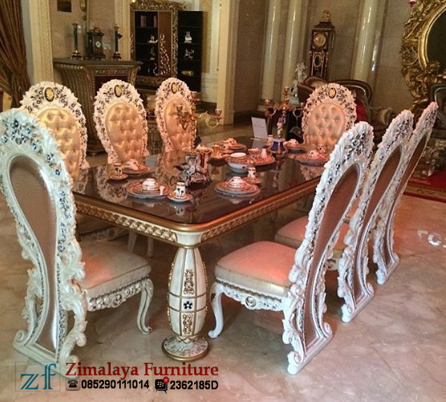 Kursi Makan Balero Ukir Mewah ini adalah salah satu koleksi kami yang terbilang sangat mewah yang pastinya cocok jika ditempatkan dirumah anda yang mewah terlebih ruang makan anda. Kursi Makan ini terdiri dari 8 kursi bermodel ukiran desain seperti kursi balero yang mana sandaranya sampai kebawah yang diguanakn menjadi kaki belakang. Kursi Makan ini juga dilengkapi dengan meja berkaki empat yang mana kakinya bermodel seperti peluru rudal yang dipercantik dengan ukiran serta pada top mejanya diberi kaca berukuran dengan mejanya. Dan untuk warnanya kami menggunakan finishing duco yang diberi warna kombinasi emas dan putih sehingga kursi terlihat bagus dan mewah.