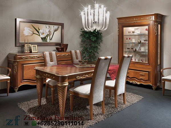 Jual Kursi Makan Elegan Modern yang sangat bagus dan mewah pas untuk memperlengap ruangan makan anda di rumah. Kursi Makan ini bermodel terbaru yang terdiri dari kursi 6 dan meja berbentuk persegi panjang yang mana kakinya mejanya berbentuk besar yang diberi variasi ulir yang bagus dan rapi. Kursi Makan ini kami namakan Elegan karena modelnya yang bagus yang dengan kaki depanya dibentuk seperti mejanya dan pada sandarangnya juga tidak semua diberi jok akan tetapi tengah atasnya diberi ukiran yang serasi dengan mejanya, oleh karena itu cocok untuk rumah model apapun.