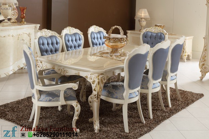 Jual Kursi Makan Model Klasik yang Bagus dan Mewah cocok untuk mempercantik dan mempermewah ruangan makan anda. Perpaduan Warna yang sangat cantik Warna ungu, Crem dan Emas menjadikan Kursi Makan Ukir ini terlihat Cantik, Elegan dan Mewah. Kursi Makan Model seperti ini paling banyak diminati dikarenakan modelnya Elegan tidak banyak ukiran serta pemberian Warna yang pas dan cocok untuk segela warna ruangan. Kursi Makan ini terdiri dari 8 Kursi dan 1 meja dengan 4 kaki dan apabila anda ingin menyesuaikan ruangan anda kami bisa sesuaikan.