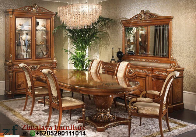 Kursi Makan Ukir Jati Mewah produk Mewah yang sangat cocok untuk mempermewah ruangan makan anda, Desain Klasik dengan kombinasi warna kayu dan busa menjadikan Kursi Makan ini terlihat Bagus dan Mewah. Kursi Makan ini terlihat sangat Mewah dan juga sangat Berkualitas dikarenakan kaki mejanya saja terlihat sangat besar oleh karena itu mengenai kualitasnya sudah tidak diragukan lagi. Kursi Makan ini terdiri dari 1 meja dengan 2 kaki dan 6 kursi makan dengan model klasik dinamis yang Bagus dan mewah cocok untuk mempercantik ruangan makan anda.