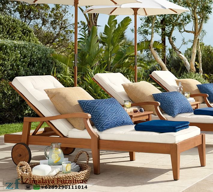 Kursi Santai Kolam Jati adalah salah satu produk furniture outdoor untuk bersantai di pinggir kolam renang atau pantai. Kursi kolam yang bagus dan elegan ini bermodel klasik yang diberi tanganan guna untuk menaruh tangan anda serta diberi roda yang terbuat dari kayu yang dibalut dengan ban. Kegunaan roda pada Kursi Tidur Kolam ini adalah biar mudah saat anda ingin mengganti posisi kursinya. Kursi kolam renang ini juga dilengkapi dengan busa/bantalan yang tebal, empuk dan tidak mudah kempes serta dilengkapi dengan meja kecil untuk menaruh sesuatu yang tengahnya diberi tiyang payung sehingga ketika anda mendudukinya tidak akan merasa kepanasan.