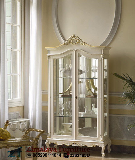 Jual Lemari Hias Kaca Modern yang diproduksi oleh pengrajin asli Furniture Jepara dari bahan-bahan berkualitas mulai dari kayu, finishing sampai dengan nanti saat packingnya. Lemari Hias ini bermodel klasik dengan ukiran khas Jepara yang rapi dan menunjukkan nilai seni tinggi serta pilihan warna yang bagus dan cantik yaitu dengan warna dasar putih doff yang dikombinasikan warna mas pada ukiranya sehingga menjadikan lemari ini terlihat bagus, cantik dan mewah. Lemari Hias ini banyak yang menyebutnya Lemari Hias Kaca karena semua lambung /ambalan lemarinya menggunakan kaca, untuk pintunya menggunakan kaca bening yang bagian lambung belakang menggunakan kaca cermin sehingga nanti jika didalamnya anda taruhin barang hias pastinya akan terlihat mamantul dan cantik.