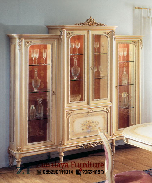 Lemari Hias Klasik Mewah pastinya banyak yang ingin memilikinya karena modelnya yang bagus bisa untuk menaruh barang hiasan anda serta bisa menambah kecantikan dan mempermewah ruangan anda. Lemari Hias ini banyak ditempatkan di ruang makan karena didalamnya bisa anda tempati barang-barang hias dapur seperti gelas, piring dan juga guci yang mana modelnya harus yang cantik dan beda dengan perbot dapur lainya.