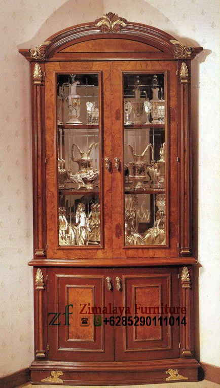 Lemari Hias Sudut Ruangan ini diproduksi oleh pengrajin spesialis langsung dari Jepara yang diproses dari bahan baku kayu jati solid yang berkualitas dikarenakan diambil langsung dari TPK perhutani. Mengenai finishingnya menggunakan finishing melamin dengan warna natural jati doff yang dikombinasikan dengan Warna Emas yang halus, rapi dan tahan lama.