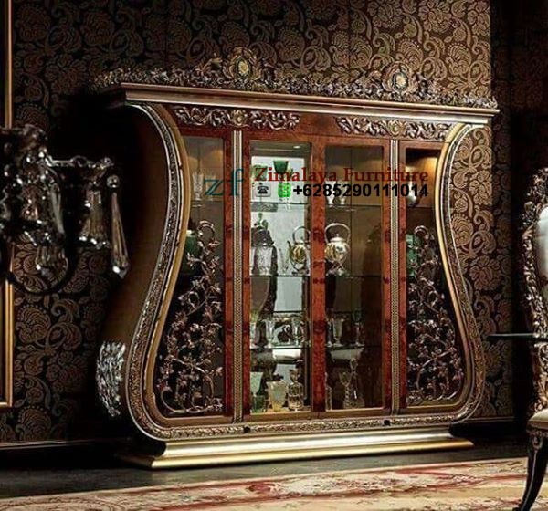Jual Lemari Hias Ukir Mahkota Mewah dengan harga yang sesuai dengan model dan kualitasnya yang pastinya jika ditempatkan pada ruang tamu anda pasti akan terlihat sangat Bagus dan Mewah. Lemari Hias ini bermodel Ukiran yang sangat Mewah yang diukir oleh pengrajin ukir Jepara yang memang ahli dibidangnya. Lemari Hias ini terdiri dari 4 Pintu yang diatasnya diberi Ukiran Mahkota yang Mewah serta pada sisi kanan dan kirinya dibentuk melengkung seperti huruf S. Perpaduan warna Natural kayu dengan Warna Emas menjadikan Lemari Hias ini terlihat sangat Bagus dan Mewah.