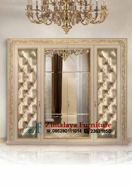 Kami sajikan barang Furniture kamar yang sangat bagus dan mewah dengan model terbaru yaitu Lemari Pakaian Mewah Terbaru dengan model minimalis 4 pintu yang dipercantik dengan ukiran simple khas Jepara berwarna emas. Lemari Pakaian ini yang membedakan dengan Lemari Pakaian lainya adalah pada pintunya diberi busa kain bludru pada kanan dan kirinya serta pada 2 pintu tengahnya diberi kaca sehingga lemari terlihat bagus, cantik dan mewah