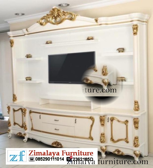 Lemari TV Putih Duco ini bermodel ukir yang seperti mahkota dan pada setiap sudutnya diberi ukiran dengan warna dasar putih doff dan ukiranya diberi warna emas sehingga lemari terlihat bagus dan mewah. Lemari TV ini tidak hanya bisa untuk menaruh tv saja akan tetapi juga bisa untuk menaruh barang hiasan anda karena diberi beberapa rak didalamnya serta juga bisa manjadi furniture hias dalam rumah anda.