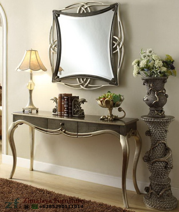 Meja Konsul Klasik Modern produk dari pengrajin Furniture Jepara dengan desain klasik modern dan perpaduan warna yang antik dan mewah cocok untuk mempercantik ruangan anda. Meja konsul dengan model 4 kaki yang kecil dihiasi dengan list-list simpel pastinya akan memanjakan mata anda saat memandangnya. Meja Konsul ini dilengkapi dengan laci ditengahnya serta dipercantik lagi dengan mirror diatasnya yang motifnya diserasikan dengan meja konsulnya.