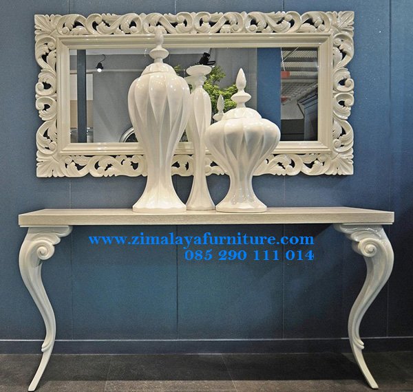 Meja Konsul Warna Putih ini kami tawarkan kepada anda yang ingin rumahnya terlihat bagus, cantik dan mewah yang kami tawarkan dengan harga yang terjangkau akan tetapi kualitas tetap yang nomer 1. Meja Konsul ini banyak ditempatkan di ruang tamu agar ruangan tamunya telihat bagus dan Mewah. Meja Konsul ini terdiri dari Meja dan Mirror dengan model ukiran yang halus dan rapi.