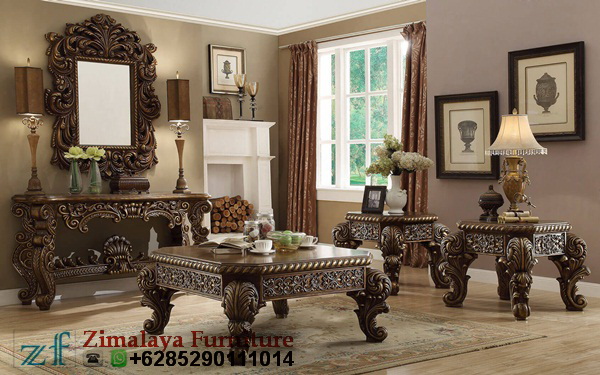 Meja Kopi Ukir Antik ini model Mewah yang kami tawarkan kepada anda untuk memperlengkap ruangan kopi/ruangan santai anda agar terlihat bagus dan lengkap dengan barang Furniture. Meja Kopi ini bermodel Klasik dengan ukiran khas Jepara yang halus, rapi dan mewah pas untuk ruangan anda yang Mewah. Pada Set Meja Kopi ini terdiri dari 3 meja dan Meja Konsul dengan ukiran dan desain yang diserasikan sehingga sangat cocok untuk menghiasi ruangan anda.