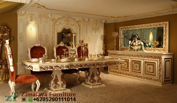 Kami dari perusahaan Furniture Jepara pada kesempatan kali kami ingin menawarkan produk Mewah untuk ruang makan anda yaitu Meja Makan Ukir 8 Kursi Mewah yang cocok untuk mengisi pada rumah anda yang Mewah. Meja Makan ini berbentuk Klasik dengan Ukiran khas Jepara yang halus dan rapi dengan 2 kaki yang besar serta dilengkapi dengan Kursi Makan Mewah yang diberi jok Warna Merah. Perpaduan Warna Putih, Emas dan Warna Merah menjadikan Meja Makan ini terlihat sangat Bagus dan Mewah karena warna-warna ini adalah warna yang menunjukan kemewahan.
