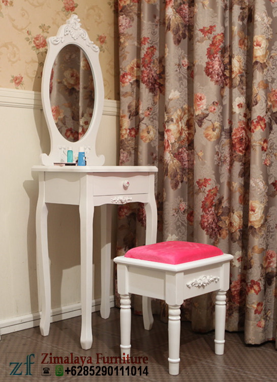 Jual Meja Rias Model Dinamis dengan harga yang relatif murah, akan tetapi sudah bisa untuk mempercantik dan memperlengkap ruangan kamar tidur anda. Meja Rias ini bermodel sangat simpel dan dinamis cocok untuk raungan anda yang tidak terlalu besar. Meja Rias ini dilengkapi dengan 1 laci dan mirror serta kursi kecil sebagai pengkapnya. Warna Putih Doff pada Meja Rias ini menjadikan Terlihat Cantik, bersih dan Elegan.