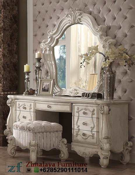 Jual Meja Rias Ukir Klasik yang sangat Bagus dan Mewah cocok untuk memperlengkap tempat berhias anda. Meja Rias ini bermodel Ukiran Klasik khas Jepara yang halus dan rapi yang diberi Warna Putih Doff yang halus serta berkualitas. Meja Rias model seperti ini cocok untuk kamar bermodel apapun baik minimalis maupun klasik oleh karena itu segera miliki Meja Rias Ukir Klasik yang Bagus dan Mewah ini untuk memperlengkap Furniture Kamar Tidur anda.