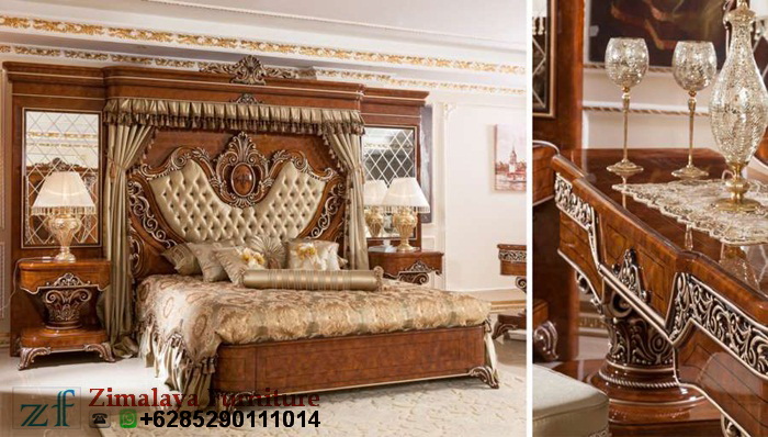 Tempat Tidur Ukir dengan gaya Eropa Klasik yang sangat Mewah ini terdiri dari Ranjang, 2 Nakas, Meja Rias, Sofa dan Lemari Pakaian 5 Pintu dengan perpaduan Warna natural jati dengan Warna Emas Klasik.