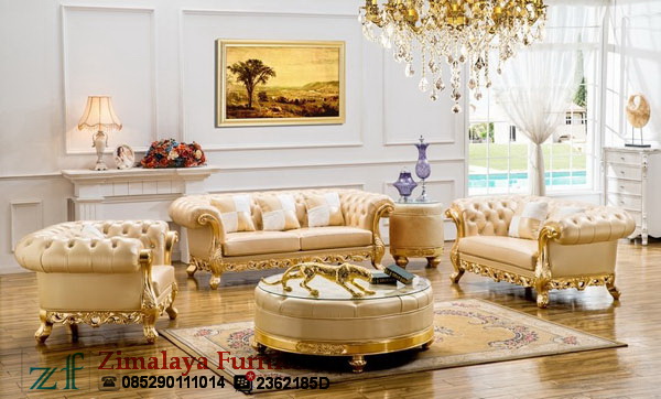 Sofa Tamu Mewah Emas ini adalah model terbaru yang sangat mewah dengan desain model eropa yang diberi warna emas pada kayunya. Sofa ini berbeda dengan sofa pada umunya yang membedakan adalah model kursi dan mejanya yaitu pada kursi sandaranya langsung busa dan untuk mejanya berbentuk busa yang dibalut dengan busa dan atasnya diberi kaca.