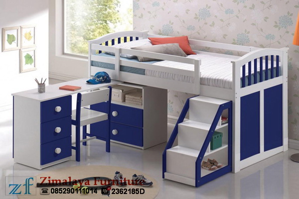 Tempat Tidur ini bermodel ranjang tingkat dengan model minimalis yang banyak fungsinya karena dengan 1 Tempat Tidur bisa untuk menyimpan bebepara perlengkapan anak seperi rak sepatu, pakaian dan buku-buku serta dilengkapi dengan meja belajar yang modelnya langsung disambung dengan tempat tidurnya. Yang menjadikan cantik pada Tempat Tidur ini adalah warna yang elegan yaitu kombinasi warna biru dan putih sehingga terlihat bagus, bersih dan berkualitas.